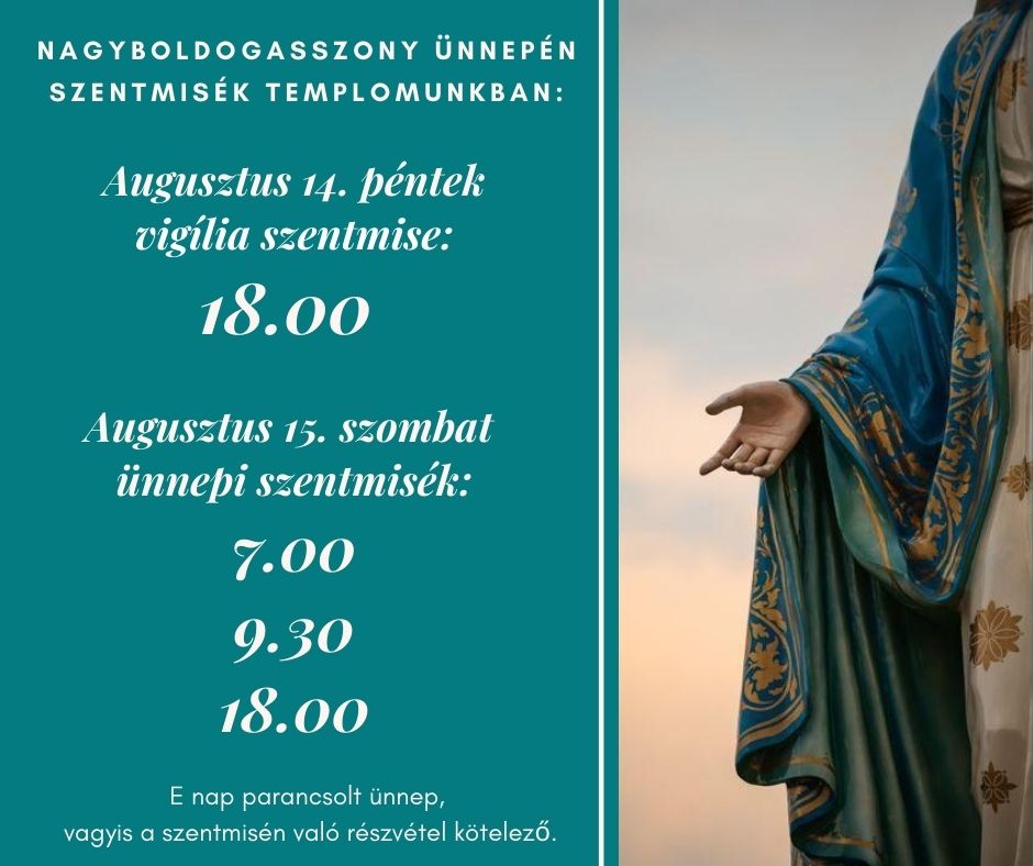 Augusztus 15-én, szombaton Szűz Mária mennybevétele, más néven Nagyboldogasszony főünnepén templomunkban szentmisék 7-kor, 9.30-kor és 18 órakor lesznek. E nap parancsolt ünnep, vagyis a szentmisén való részvétel kötelező. Pénteken 18 órakor vigília szentmise is lesz.
